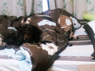 ベットの上から冷やかな目で見る2ワン。
