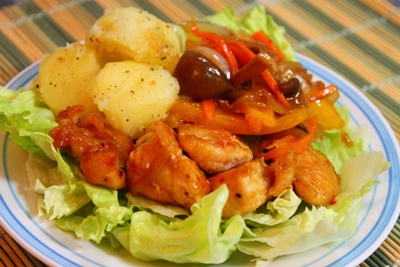 鶏ムネ肉をハーブにつけて、小麦粉をつけて焼いたものに